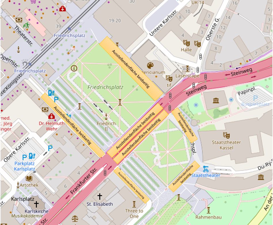 - Veranstaltungsstrecke – vorgesehene Flächen für Ausstellende (gelbe Markierungen)